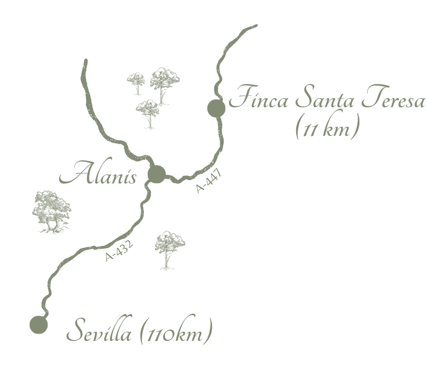 Para trasladarnos a la Finca Santa Teresa con posterioridad, nos dirigimos por la carretera A-447 dirección Fuente Obejuna durante 11,9km. El acceso está señalizado con el nombre del cortijo.